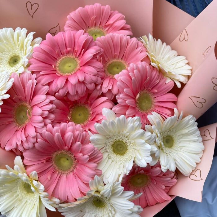 Гербера – 15 шт.Упаковка дизайнерская – 1 шт.Лента – 1 шт.