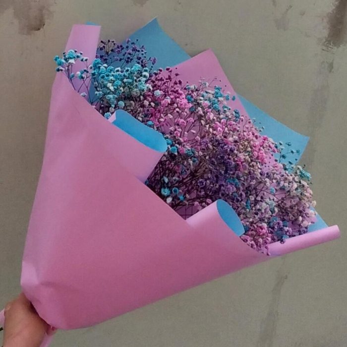 Лента – 1 шт.Упаковка дизайнерская – 7 шт.гипсофила радужная – 9 шт.