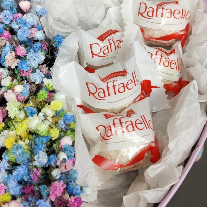 гипсофила радужная – 3 шт.Конфеты Raffaello – 5 шт.Коробка сердце – 1 шт.Губка флористическая – 1 шт.Тишью белое – 1 шт.