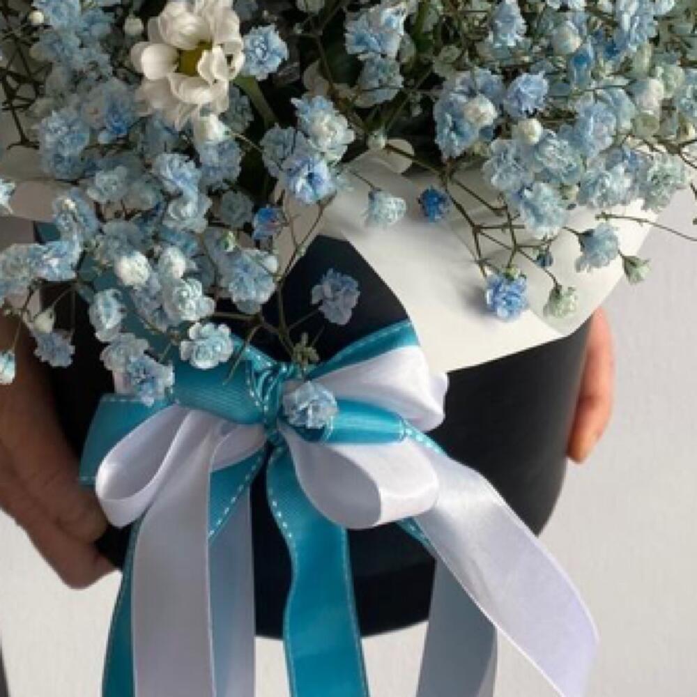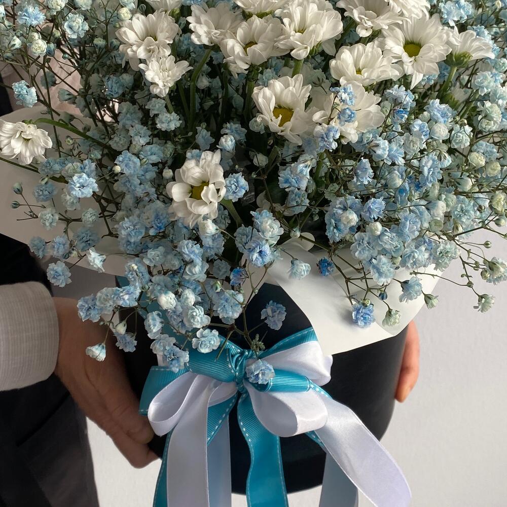 Гипсофила – 7 шт.Сантини – 3 шт.Шляпная коробка с лентами – 1 шт.