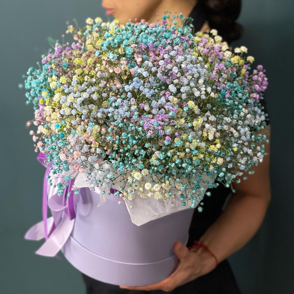 Лента – 2 шт.Тишью – 1 шт.Коробка шляпная – 1 шт.Оазис флористический – 1 шт.Гипсофила крашеная – 9 шт.