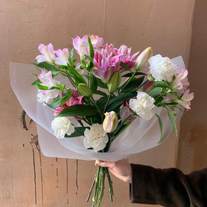 Альстромерия – 2 шт.Гвоздика белая – 5 шт.Авторская упаковка – 1 шт.лилия махровая розовая – 2 шт.