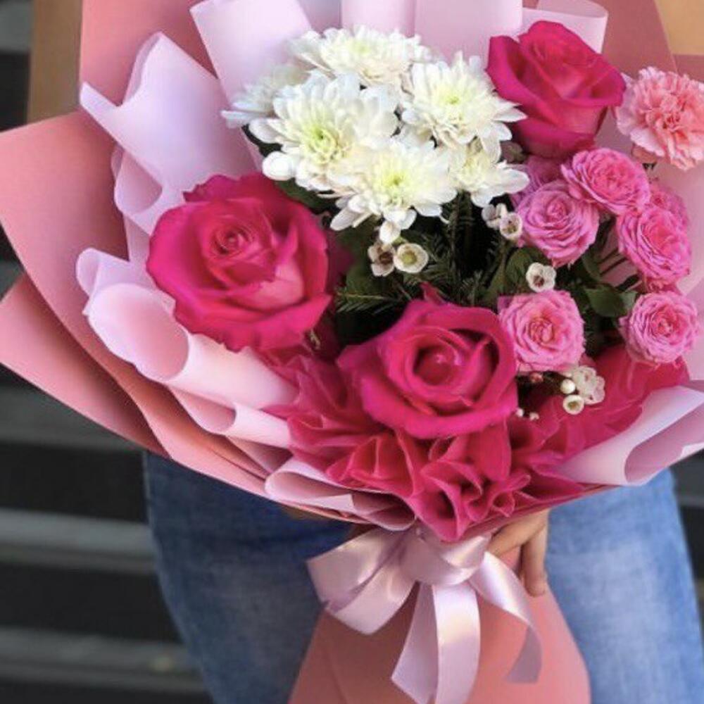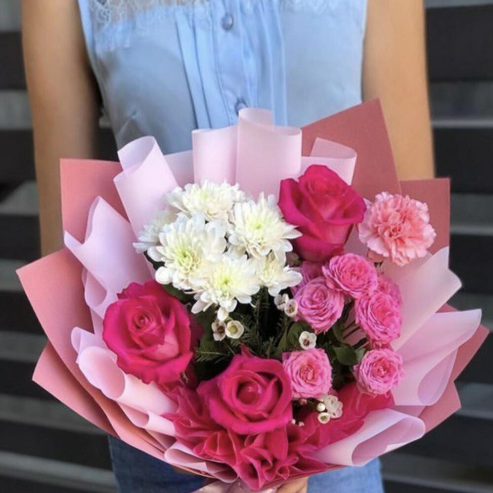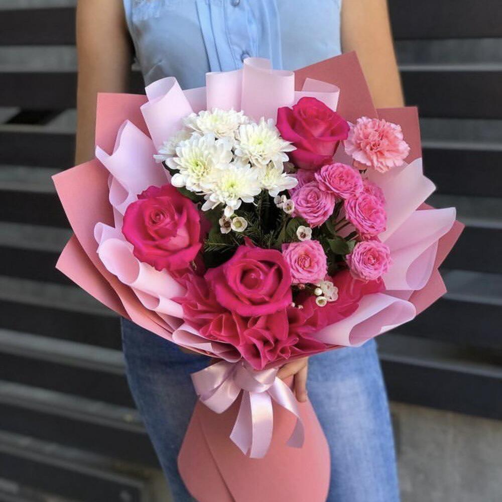 Альстромерии, Гвоздики, Кустовые розы, Лизиантусы, Розы, Хризантемы