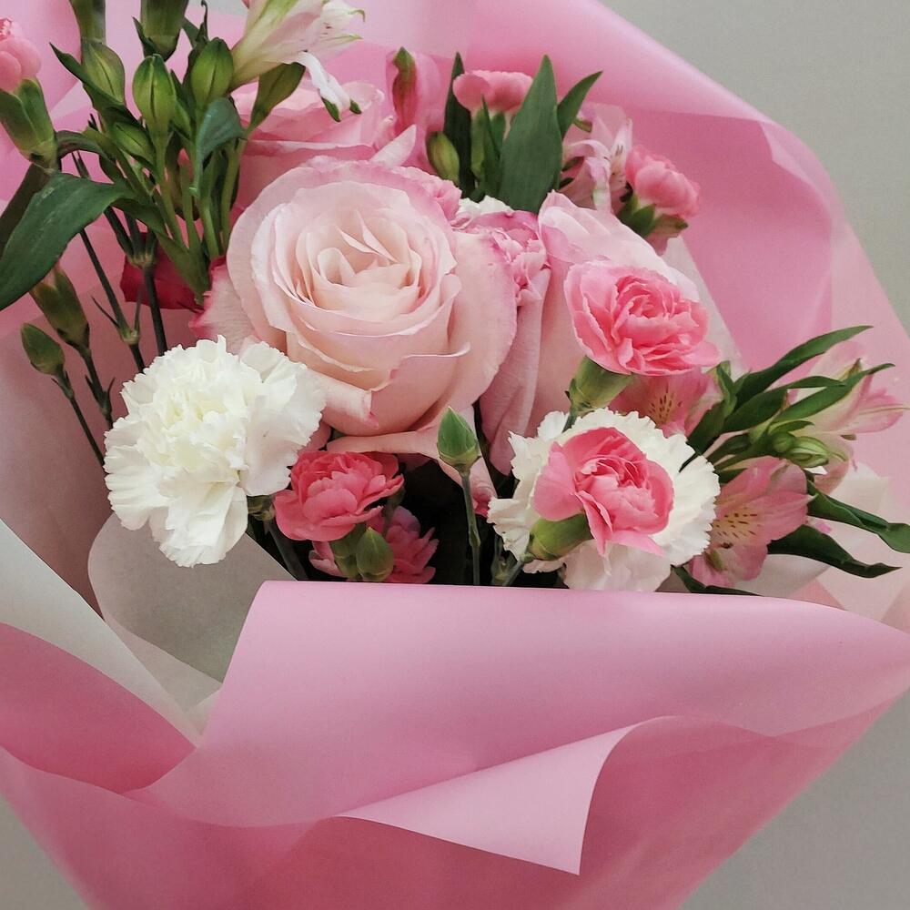 Роза – 3 шт.Гвоздика кустовая – 4 шт.Гвоздика – 6 шт.Альстромерия – 3 шт.Тишью – 2 шт.Авторская упаковка – 1 шт.Лента атласная – 1 шт.