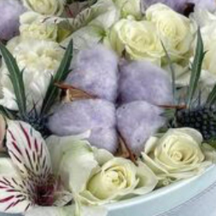 Альстромерия – 1 шт.Хлопок – 3 шт.Роза – 3 шт.Кустовая роза – 2 шт.Гвоздика – 4 шт.Оазис – 1 шт.Бант – 3 шт.Коробка – 1 шт.