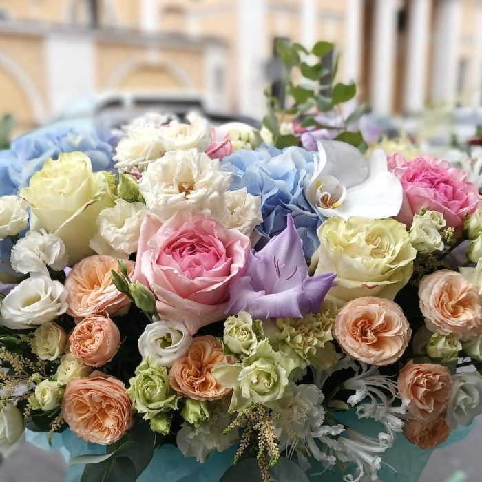 Коробка шляпная – 1 шт.Калька упаковка – 4 шт.оазис флористический кирпич – 2 шт.гортензии – 3 шт.Эвкалипт – 10 шт.Лизиантус – 5 шт.Астильба – 5 шт.Гладиолус – 3 шт.розы кустовые пионовидные – 7 шт.розы кустовые – 10 шт.Нерина – 5 шт.розы пионовидные – 7 шт.орхидея – 3 шт.Диантус кустовой – 7 шт.