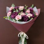 хризантема бигуди – 10 шт. Гвоздика – 9 шт. Эвкалипт – 2 шт. Оформление – 1 шт.
