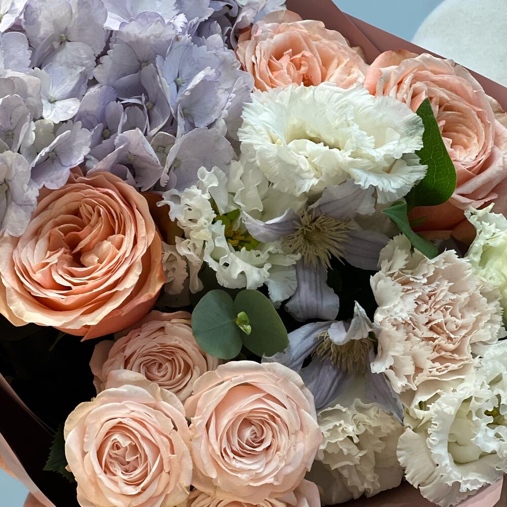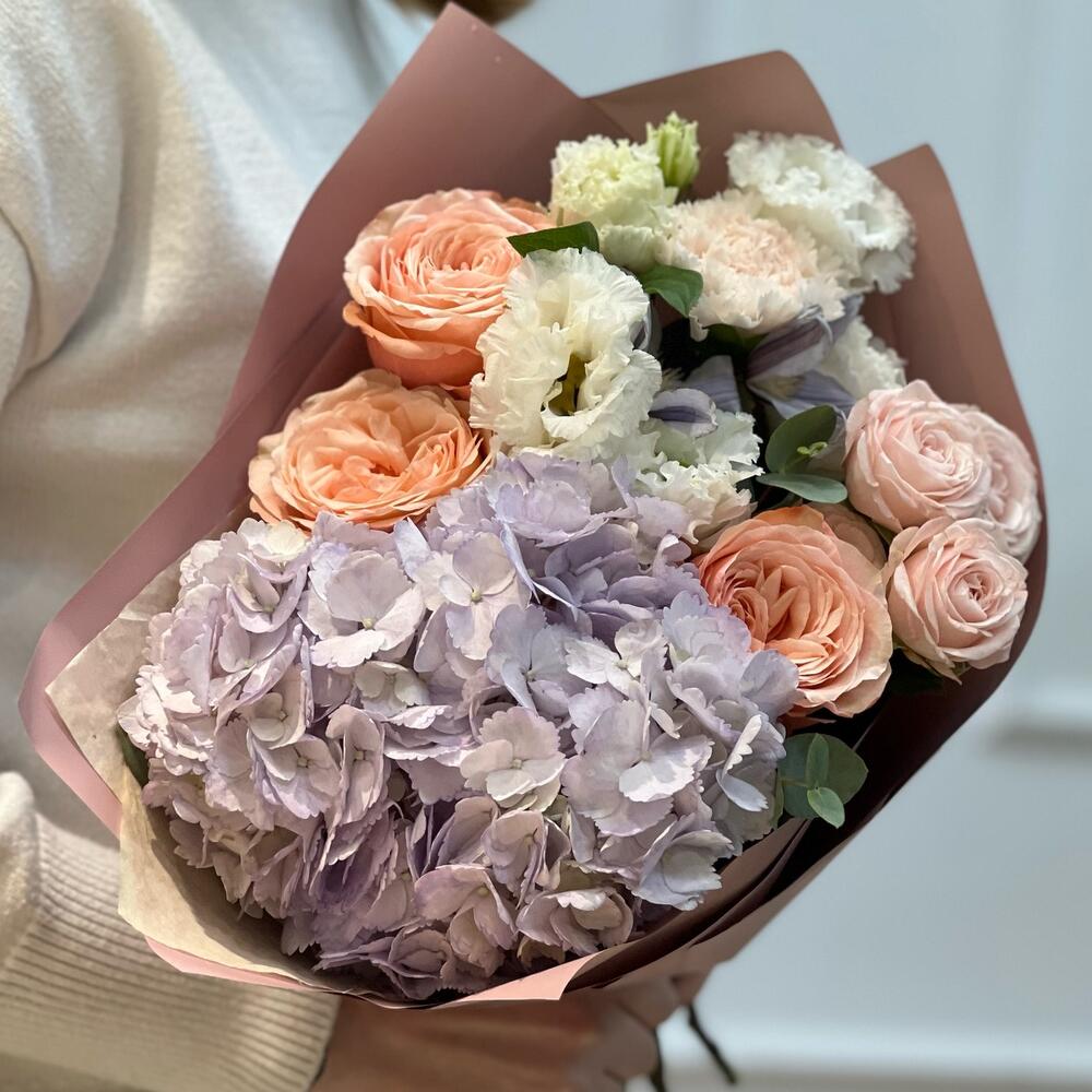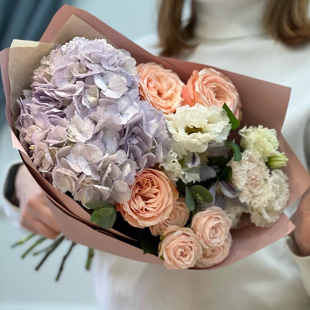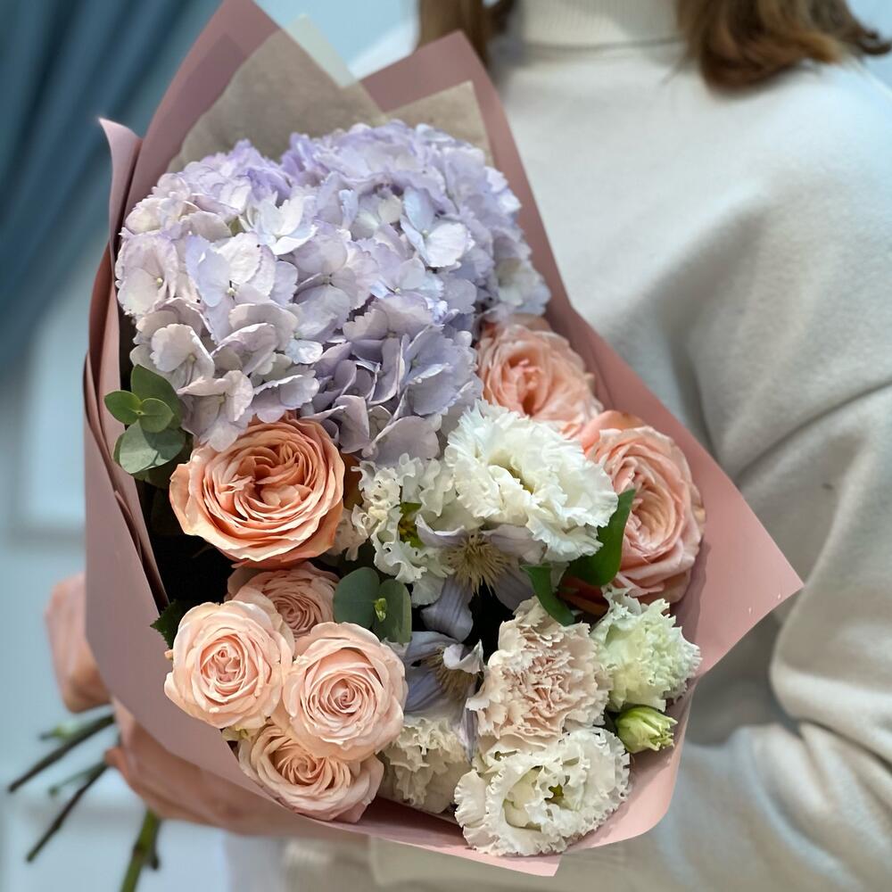 Красивый букет с гортензией и пионовидными розами «Чувствуя тебя»