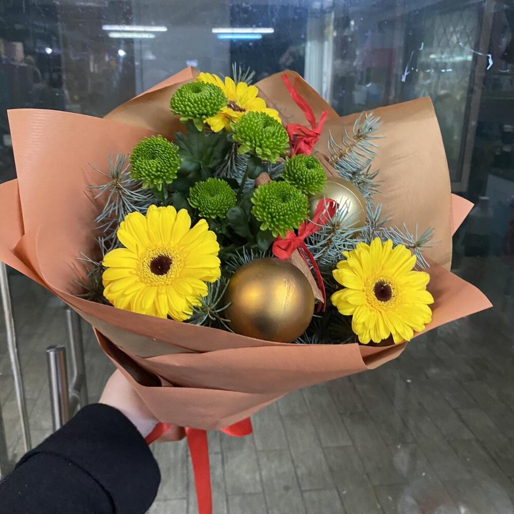 Гербера – 3 шт. Ель – 1 шт. Упаковка дизайнерская – 1 шт. хризантемы кустовые – 1 шт. инрушки новогодние – 3 шт.