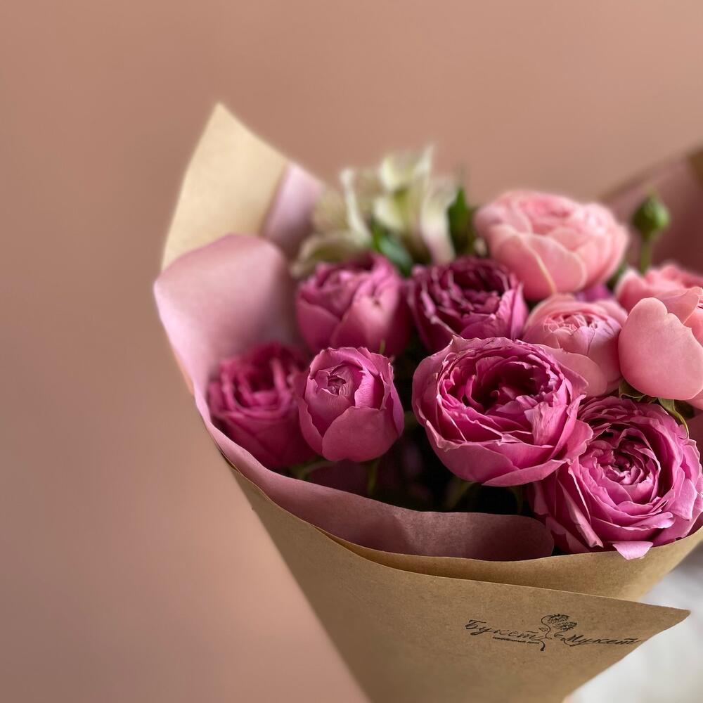 Альстромерия – 1 шт.Лента атласная – 1 шт.Тишью – 1 шт.Крафт – 1 шт.роза кустовая пионовидная кения – 3 шт.