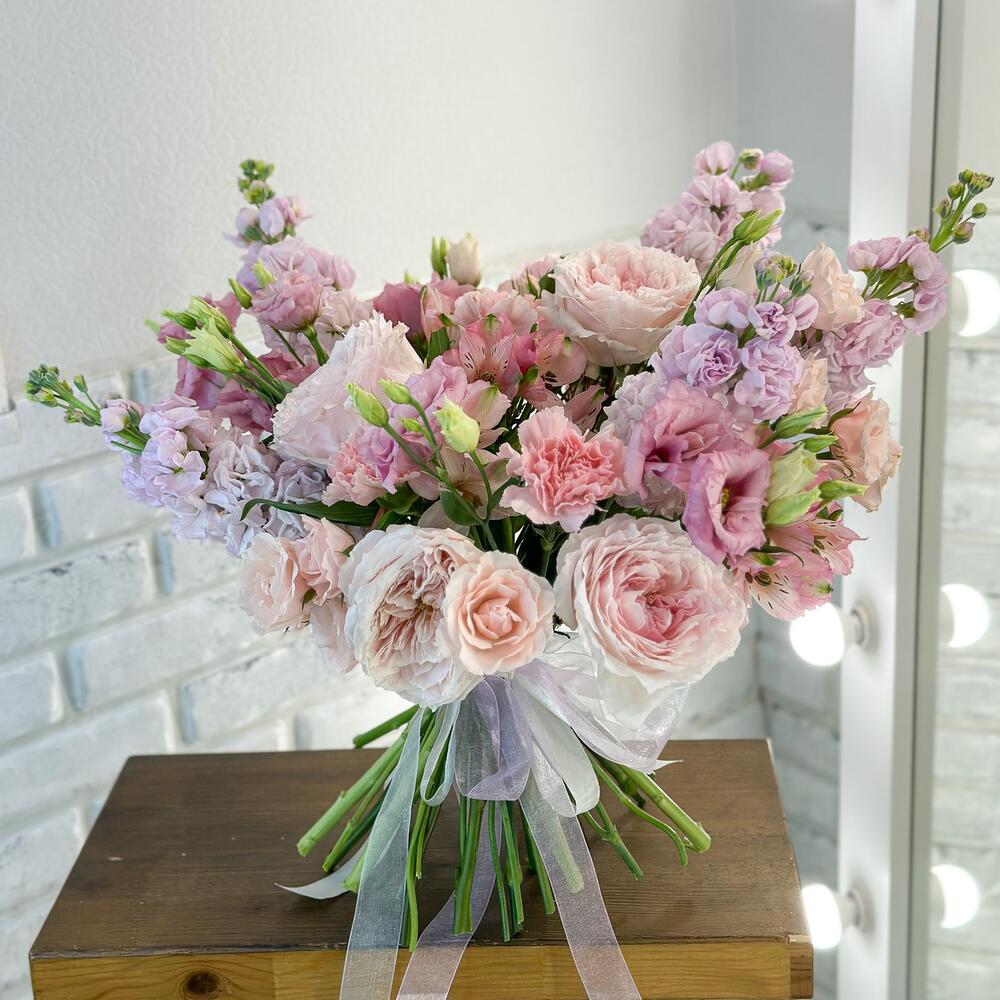 Альстромерия – 5 шт.Лизиантус – 5 шт.Роза кустовая – 5 шт.Лента атласная – 3 шт.Маттиола розовая – 5 шт.роза садовая пионовидная – 5 шт.подкормка для срезанных цветов – 1 шт.инструкция по уходу за цветами – 1 шт.
