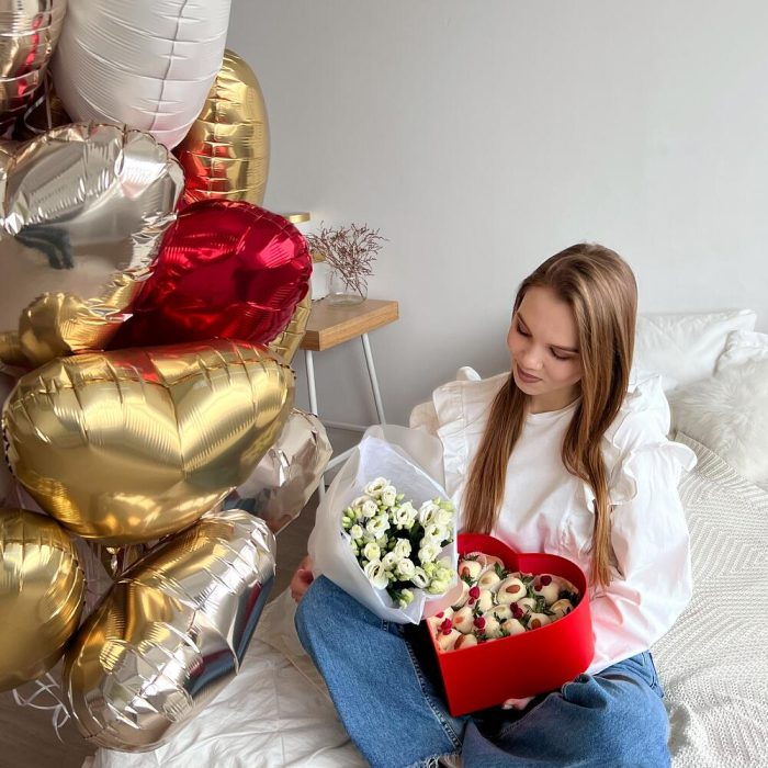 эустома белая – 5 шт.сердце фольгированное – 20 шт.клубника в бельгийском шоколаде – 22 шт.бокс сердце – 1 шт.