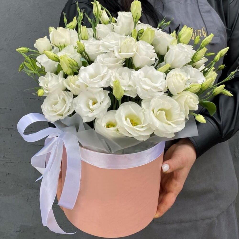 Шляпная коробка гортензией, пионами, эустомой, тюльпанами, гиацинтами, фрезией и гвоздикой "Джоанна"