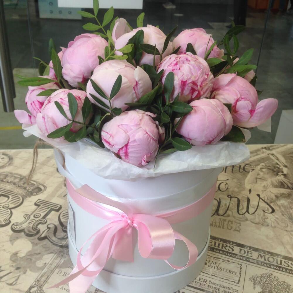15 пионов в шляпной коробке с фисташкой