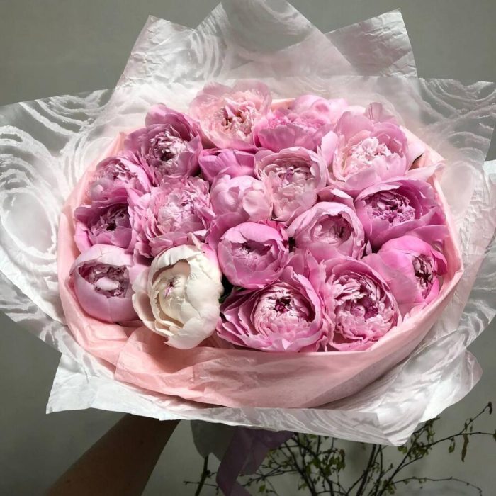 Лента атласная – 1 шт.Пион Сара Бернар – 19 шт.Упаковка дизайнерская – 2 шт.