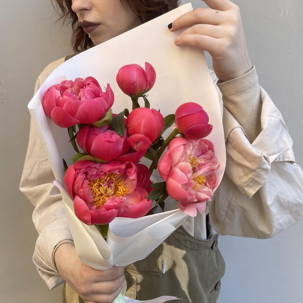 Аккуратный букет из пионов корал шарм 7 шт / 1367 id