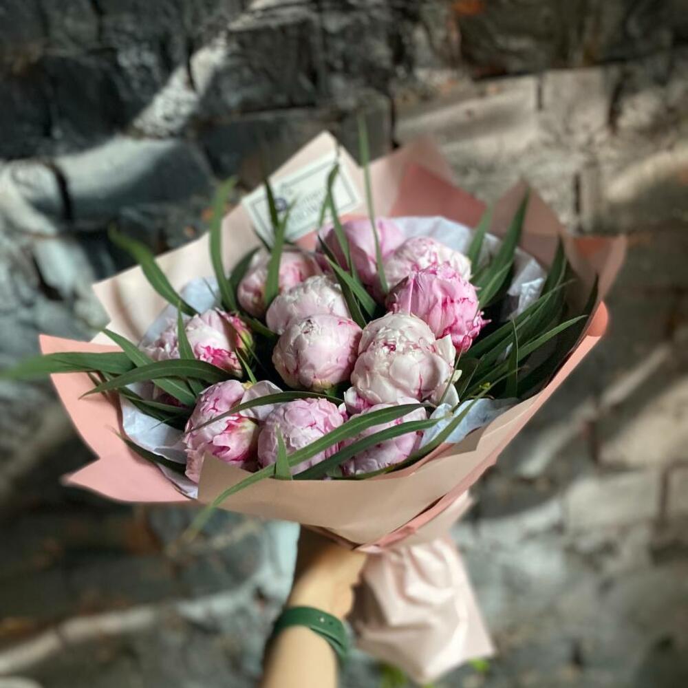 Букет из 11 пионов и эвкалипта в дизайнерской упаковке “Аромат пионового облака”