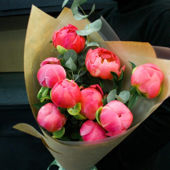 Пион Коралл Шарм (Coral Charm) – 9 шт.Эвкалипт – 3 шт.Дизайнерская упаковка – 1 шт.