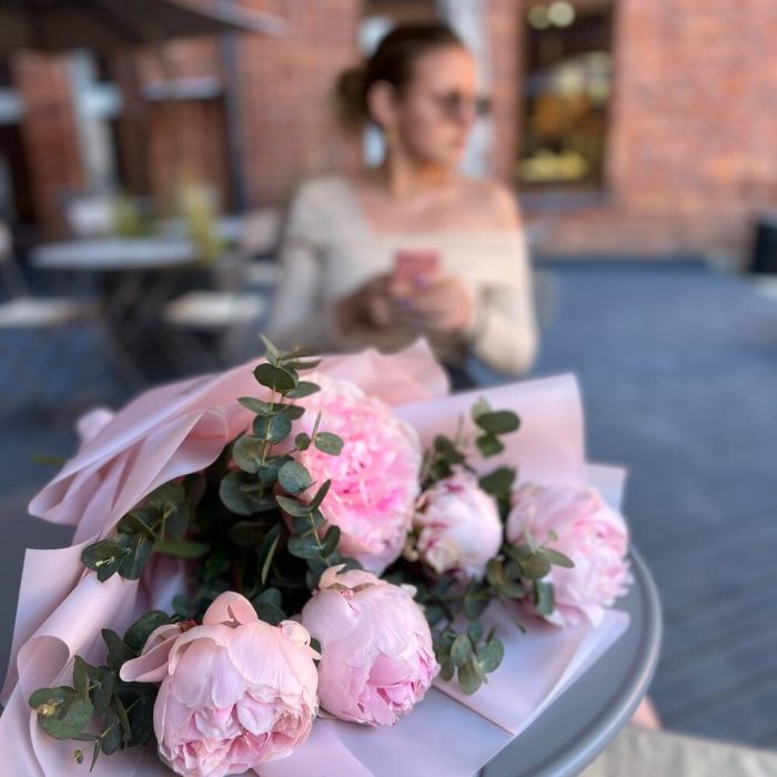 Эвкалипт – 1 шт.Лента атласная – 1 шт.Пион Сара Бернар – 5 шт.Пленка дизайнерская – 2 шт.