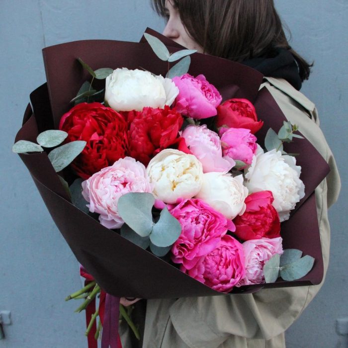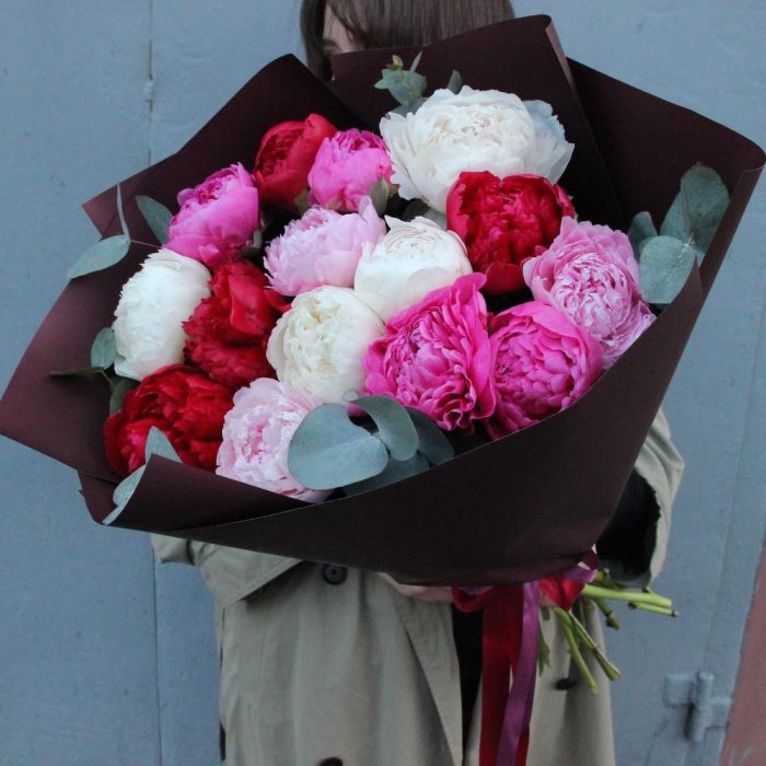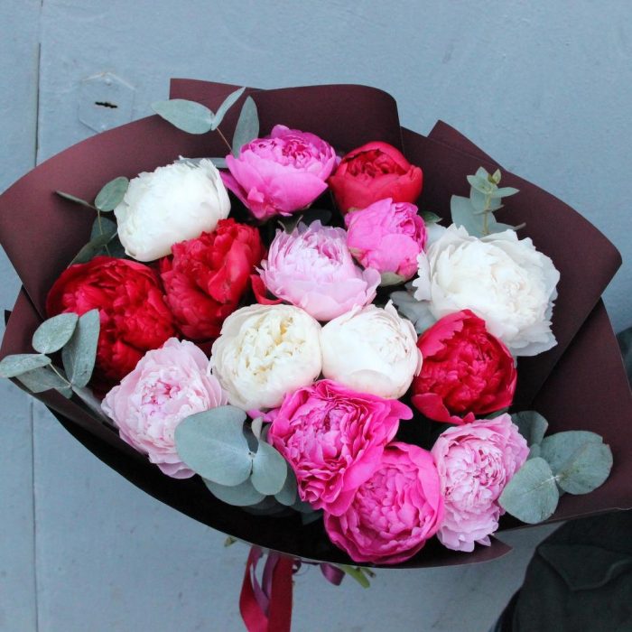 Пион – 15 шт.Эвкалипт – 7 шт.Упаковка – 3 шт.Лента атласная – 2 шт.