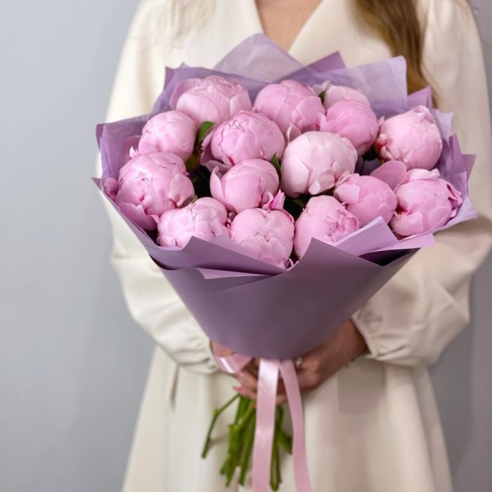 Букет из шикарных ароматных розовых пионов сорта Сара Бернар.Пионы распускаются еще в вазе и будут радовать до 5-7 дней.Степень раскрытия пионов всегда разная, мы можем гарантировать со своей стороны свежесть цветов.К каждому букету мы прикладываем:- открытку с Вашими пожеланиями- инструкцию по уходу за букетом- пакетик кризала для продления жизни цветов