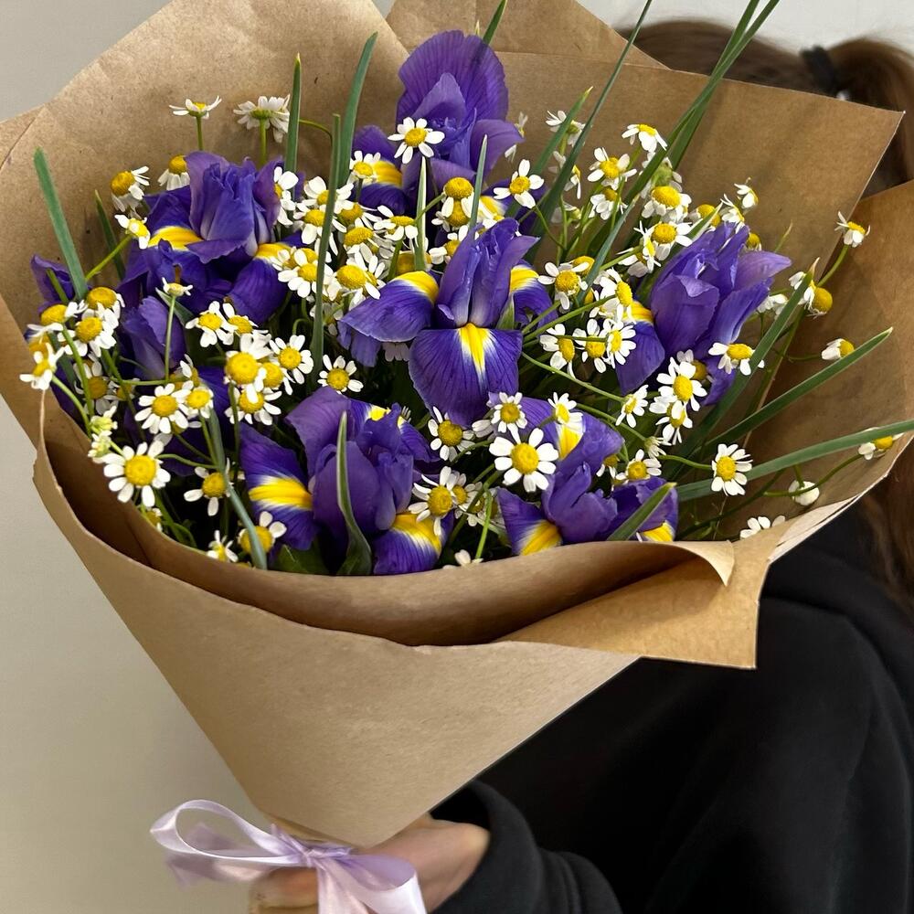 Букет из нежной ромашки и ярких фиолетовых ирисов