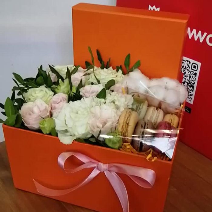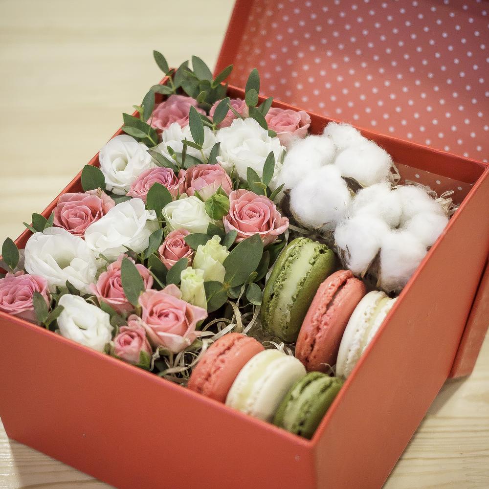 Кустовая роза – 5 шт.Коробка подарочная – 1 шт.Фисташка – 1 шт.Хлопок натуральный – 2 шт.эустома белая – 3 шт.Макарон – 6 шт.Губка флористическая – 1 шт.