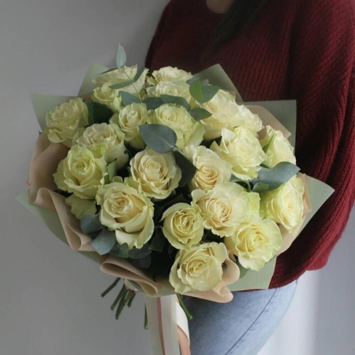 Эвкалипт – 5 шт.Дизайнерская упаковка – 2 шт.mondial роза одноголовая 60 см – 25 шт.
