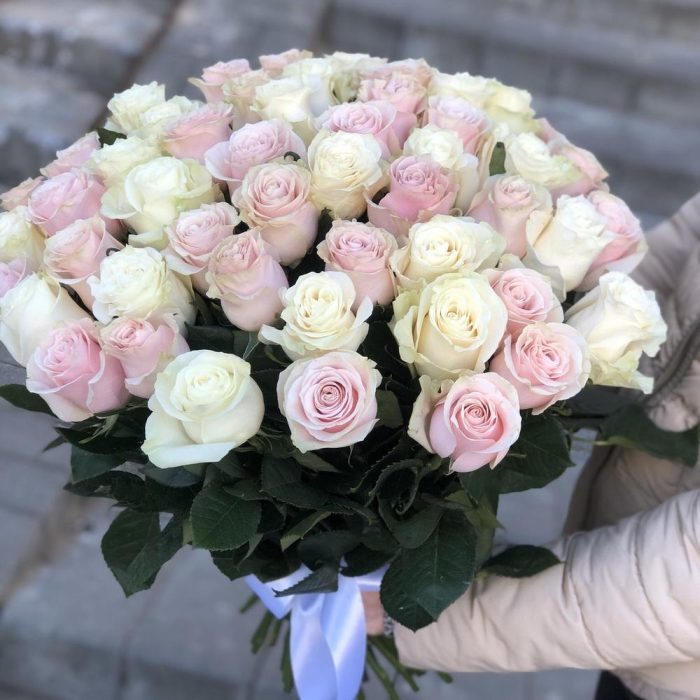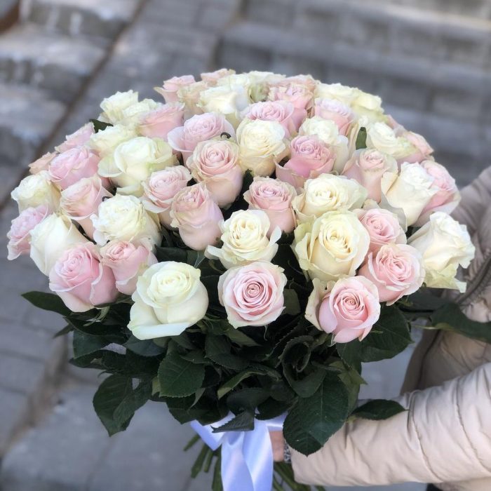 Букет из 51 бело-розовой розы сорта Mondial и Pink Mondial