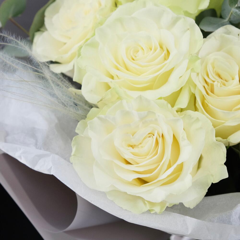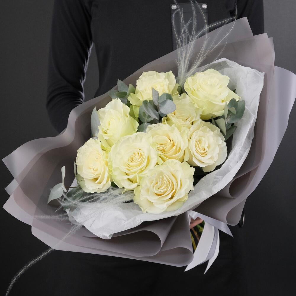 9 белых роз Мондиаль с эвкалиптом