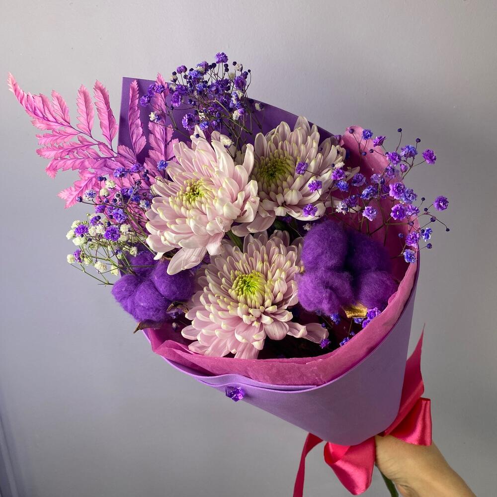 Фиолетовый стильный букет для выражения настоящих глубоких чувств Хризантема цвета аметист придаёт букету индивидуальности и загадочностиУважаемые покупатели! Пожалуйста обратите ваше внимание на размер букета при заказе! Он учитывается вместе с упаковкой Чтобы наши прекрасные букеты дольше радовали получателя рекомендуем вам: ⭐Обновить срез букета перед тем, как поставить его в воду⭐Ставить цветы в прохладную проточную воду ⭐Меняйте воду в вазу каждый день⭐Не забывайте подрезать цветы, перед тем, как ставить их в воду⭐Не ставить у отопительных приборов и на сквозняке Фирменный стиль наших букетов разработан специально так, чтобы упаковку не нужно было снимать, так как она придаёт целостность букету и прекрасно держится в вазе