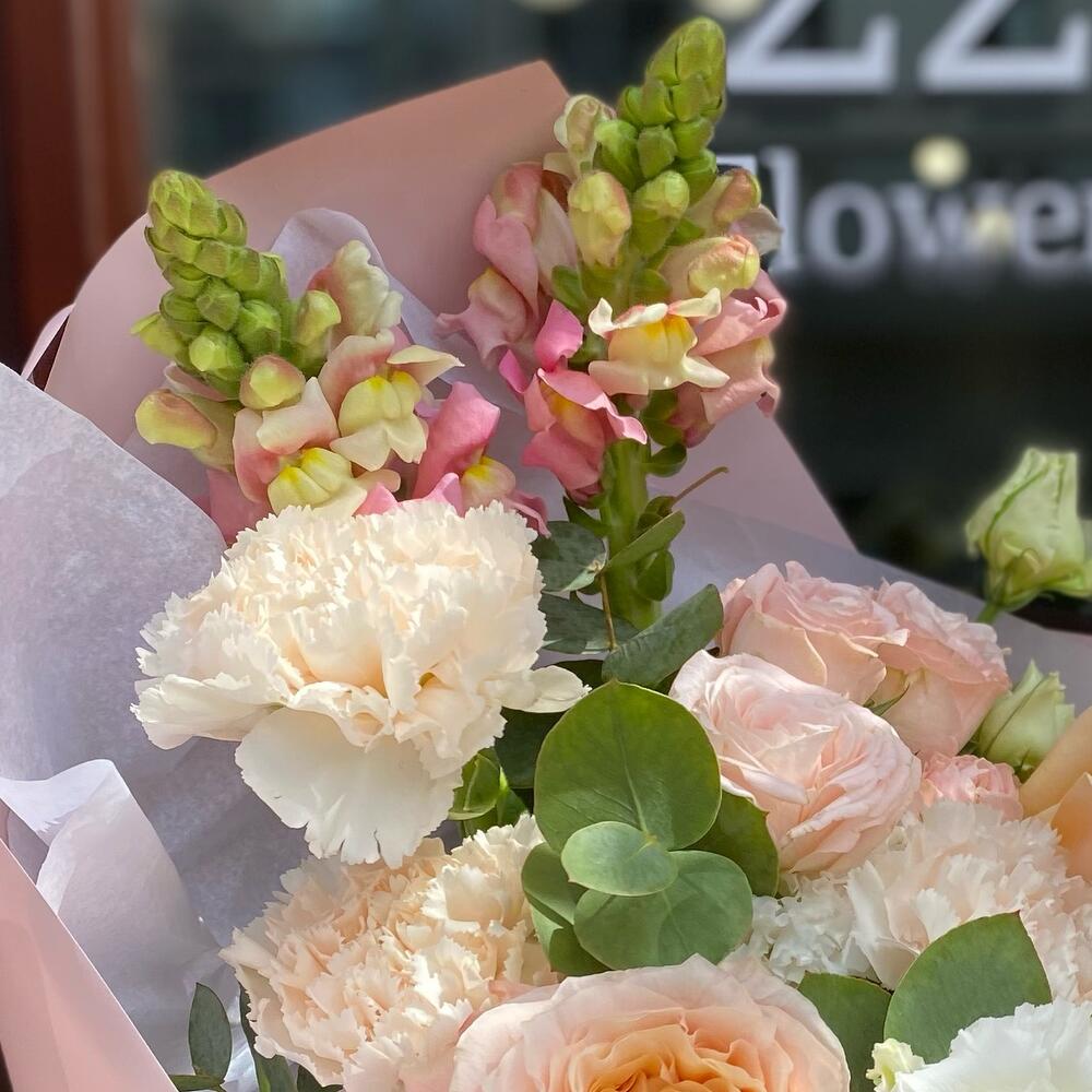 Лента атласная – 1 шт.Кустовая роза Бомбастик – 2 шт.Упаковка дизайнерская – 4 шт.Эвкалипт Микс – 3 шт.Роза шиммер – 3 шт.Диантус сортовой – 3 шт.антиринум – 2 шт.эустома алиса белая – 1 шт.