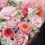 Маттиола – 7 шт.Эвкалипт – 3 шт.Тишью – 2 шт.Пионовидная роза – 6 шт.Атласная лента – 2 шт.Французская роза – 7 шт.Матовая пленка – 2 шт.