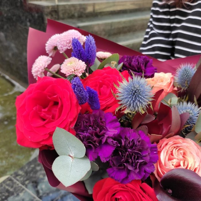 Borsch – Букет из алых роз,эрингиума и калл
