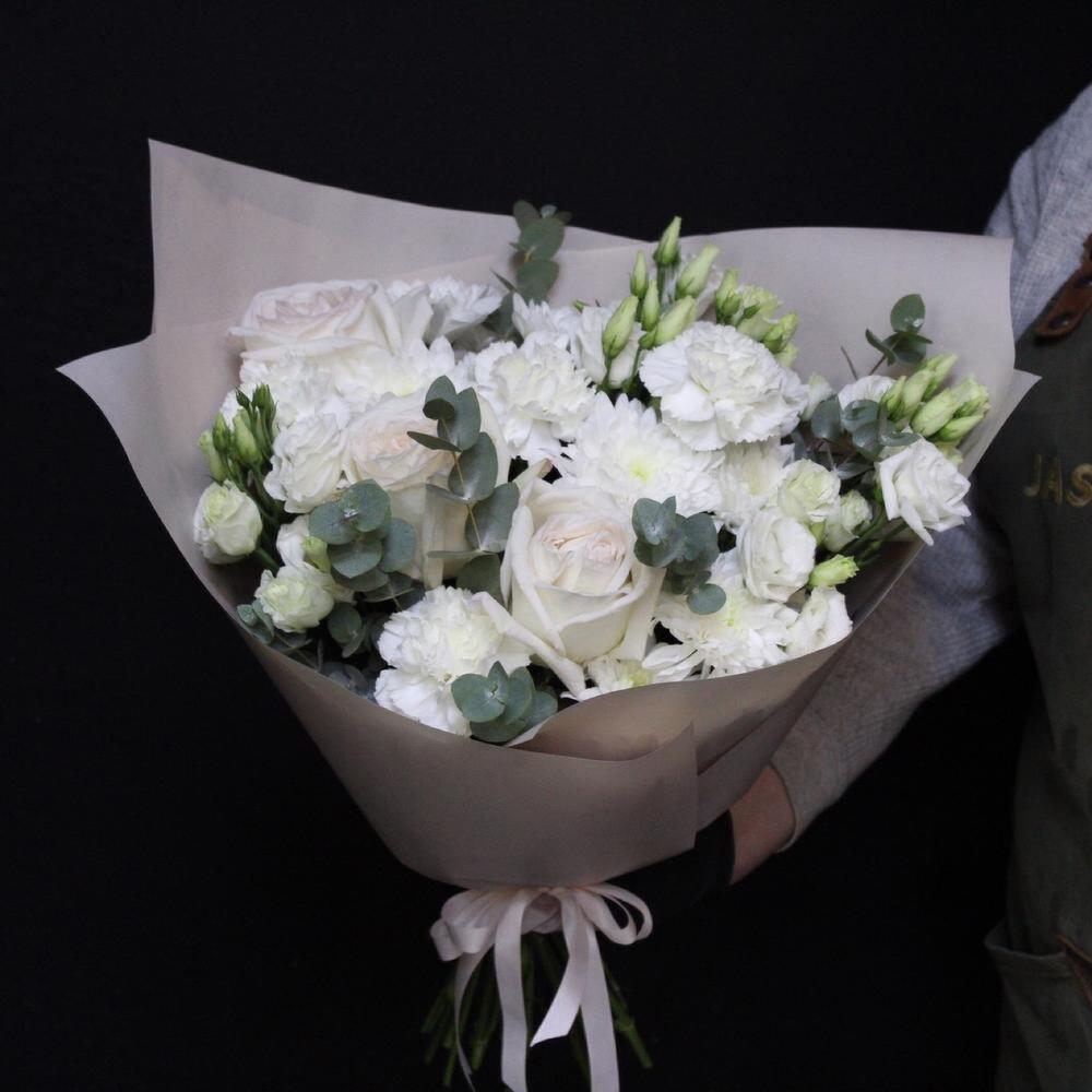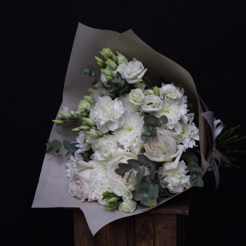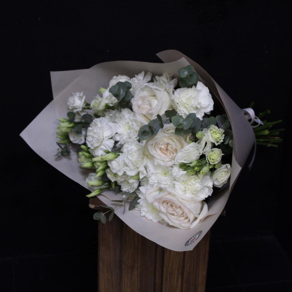 роза пионовидная white o’hara – 3 шт.Хризантема кустовая – 2 шт.Диантус сортовой – 5 шт.Эустома – 5 шт.Эвкалипт – 3 шт.Пленка дизайнерская – 3 шт.Лента атласная – 1 шт.
