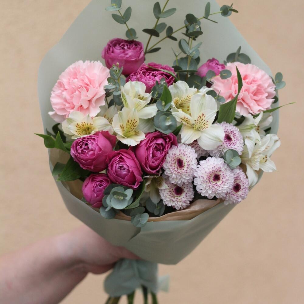 Роза пионовидная кустовая – 2 шт. Альстромерия – 2 шт. Диантус розовый – 2 шт. Хризантема Сантини – 1 шт. Эвкалипт Гунни – 3 шт.