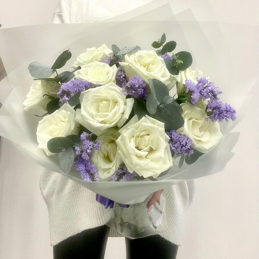 Роза – 11 шт.Статица – 2 шт.Эвкалипт – 3 шт.Упаковка – 1 шт.Лента – 1 шт.