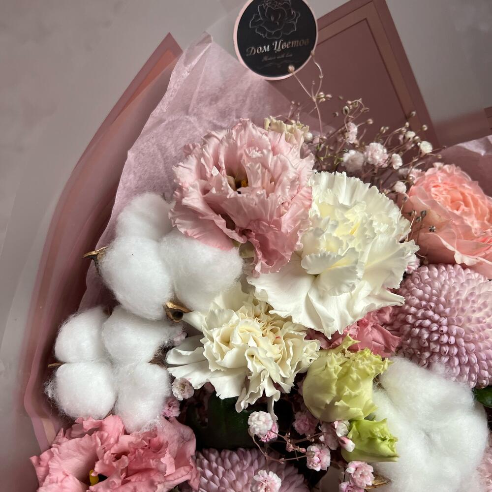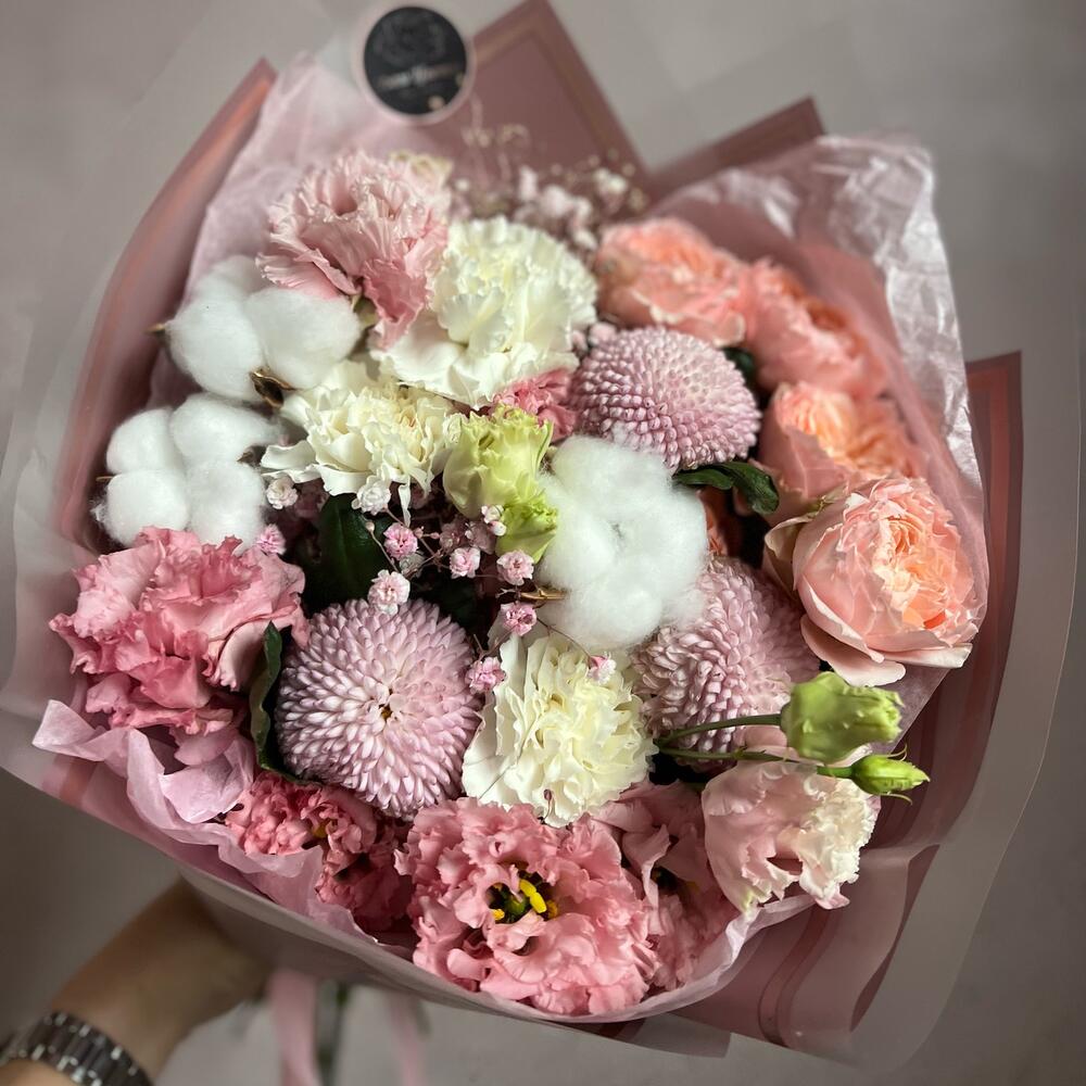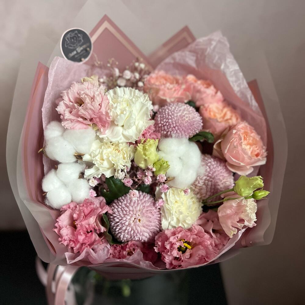momoko – 3 шт.Лизиантус – 1 шт.Гипсофила – 1 шт.Диантус – 3 шт.Кустовая пионовидная роза – 1 шт.Хлопок – 3 шт.декоративная упаковка – 1 шт.Атласная лента – 1 шт.