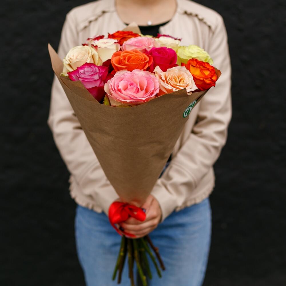 Лента – 1 шт.Роза Эквадор – 15 шт.Крафт бумага – 2 шт.