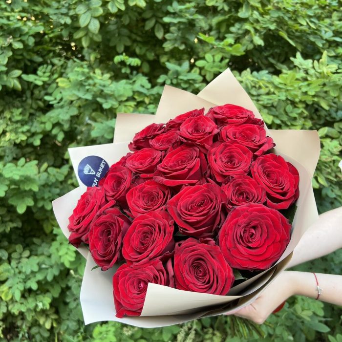 Лента атласная – 1 шт.пленка цветная – 2 шт.красная роз – 21 шт.