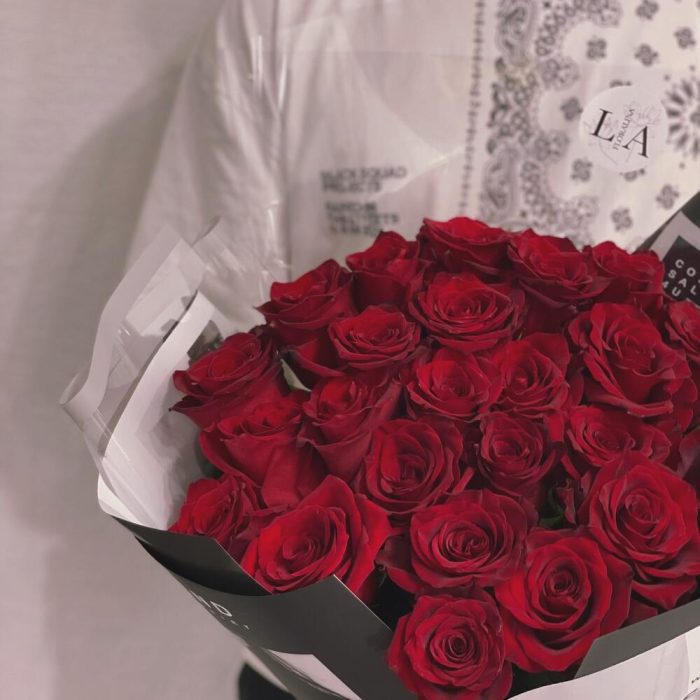 Роза Эквадор – 25 шт.Лента атласная – 2 шт.Упаковка дизайнерская – 5 шт.