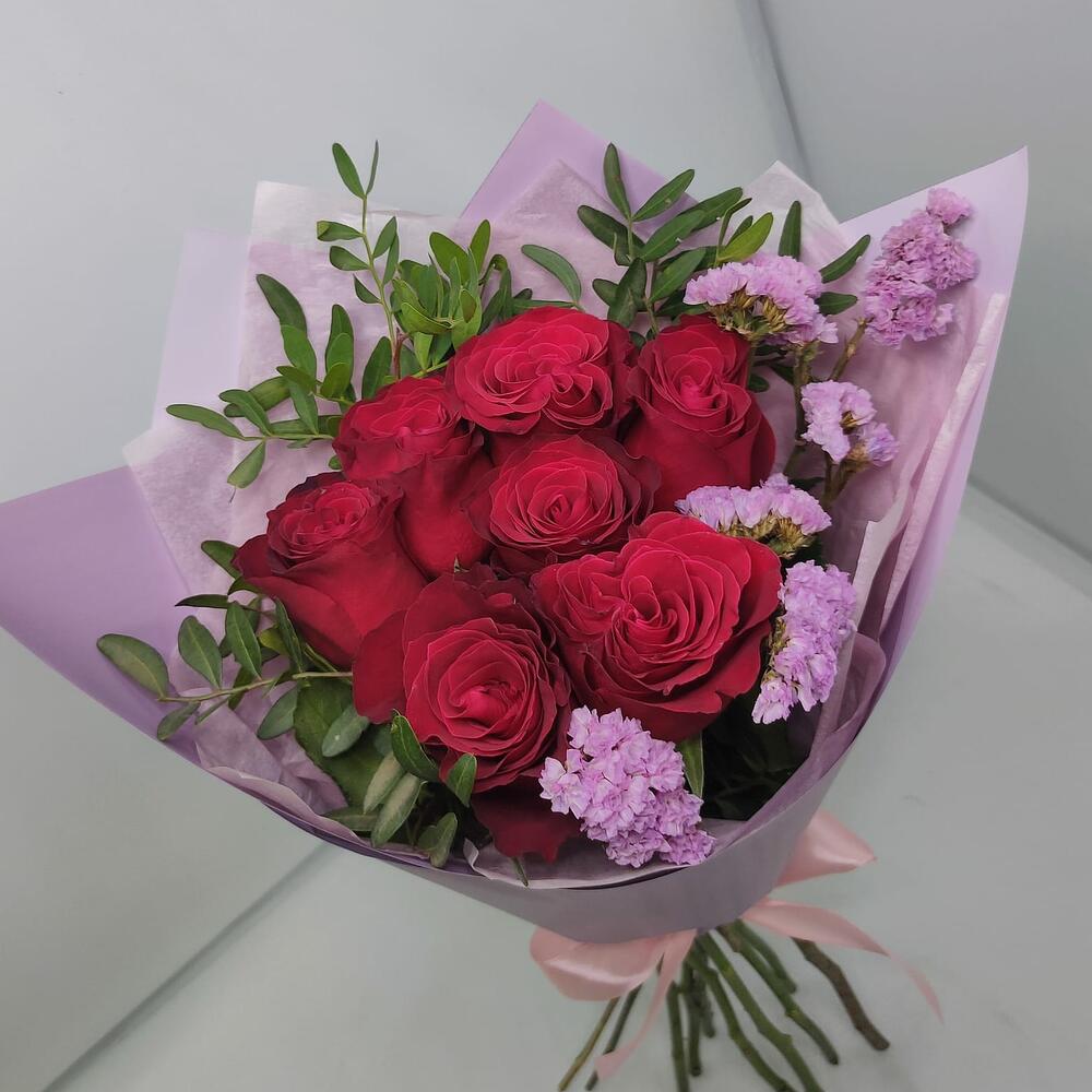 Роза эквадор 50 см – 7 шт.Статица – 1 шт.зелень фисташки – 1 шт.Дизайнерская упаковка – 1 шт.