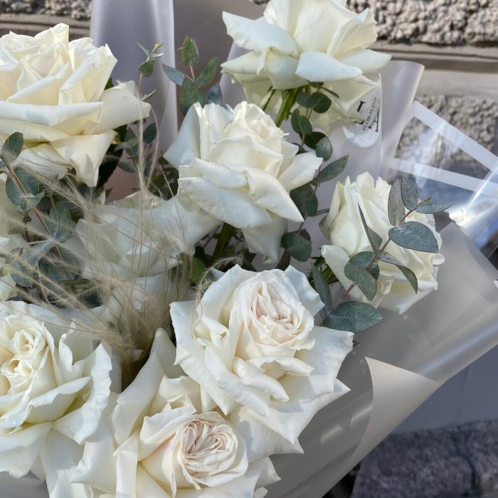 Эвкалипт – 4 шт.Роза – 9 шт.Лента атласная – 2 шт.Упаковка дизайнерская – 6 шт.Ковыль – 1 шт.