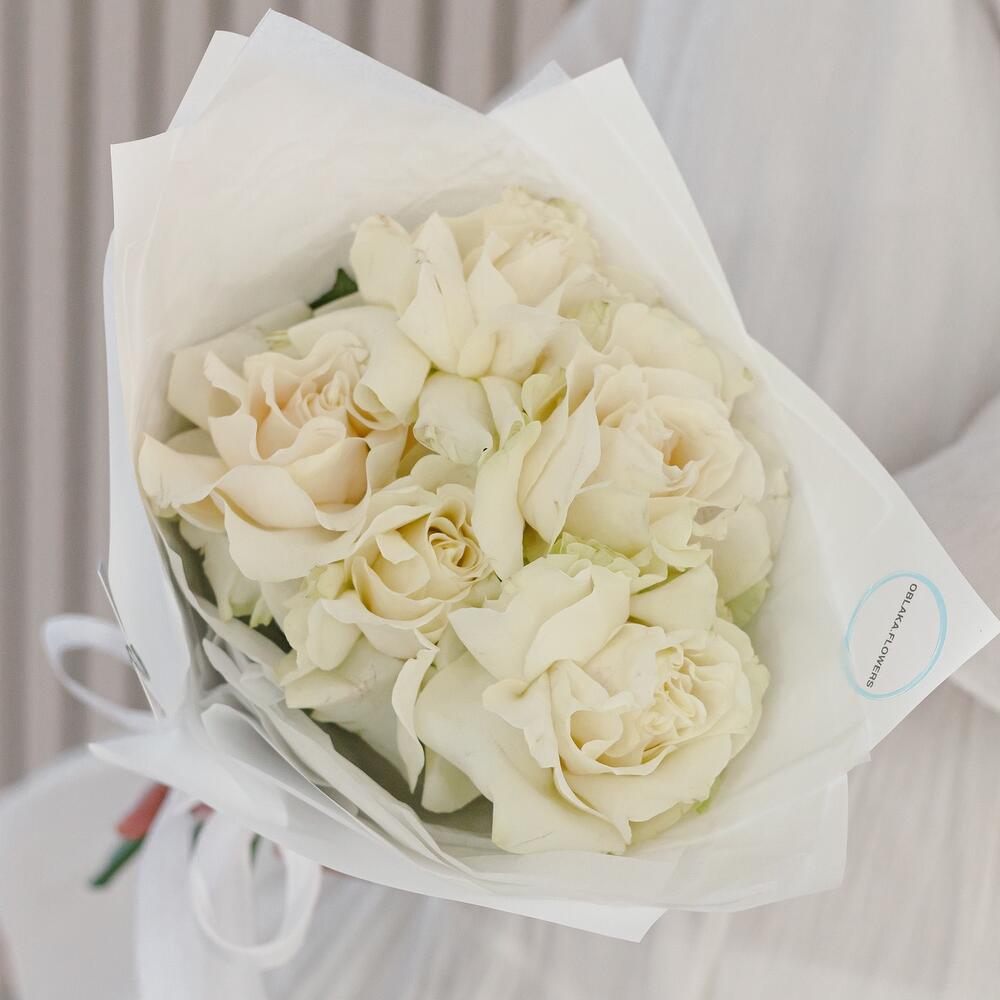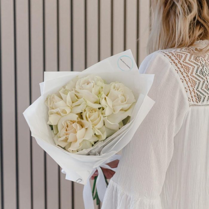 Лента атласная – 1 шт.Тишью – 2 шт.Роза французская – 5 шт.Корейская пленка – 2 шт.Пакет крафтовый – 1 шт.инструкция по уходу за цветами – 1 шт.