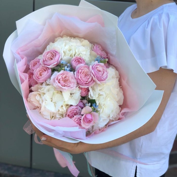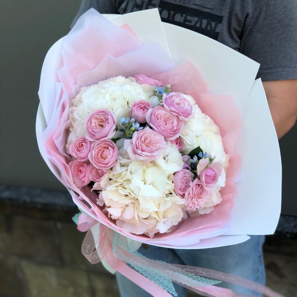 Букет из пионовидной розы, гортензии и оксипеталума «Нежность»