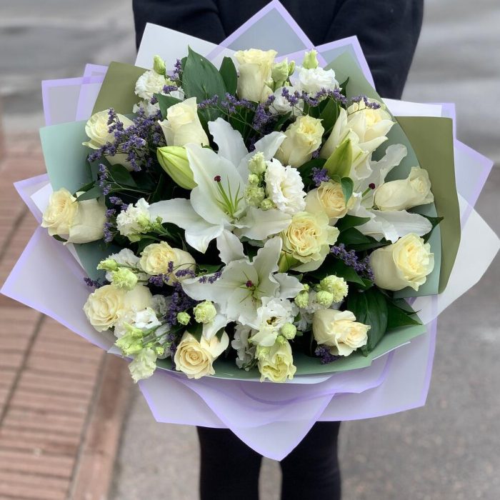 Роза – 15 шт.Лилия – 2 шт.Лизиантус – 4 шт.Лимониум – 2 шт.руссус – 20 шт.Дизайнерская упаковка – 2 шт.