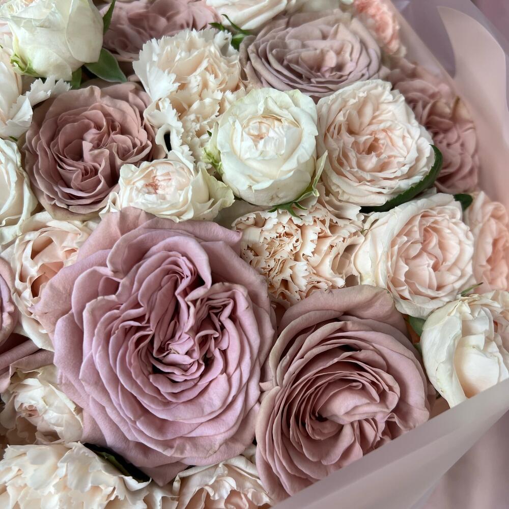 Пионовидная роза – 12 шт.Кустовая роза – 7 шт.Диантус – 9 шт.декоративная упаковка – 1 шт.Атласная лента – 1 шт.