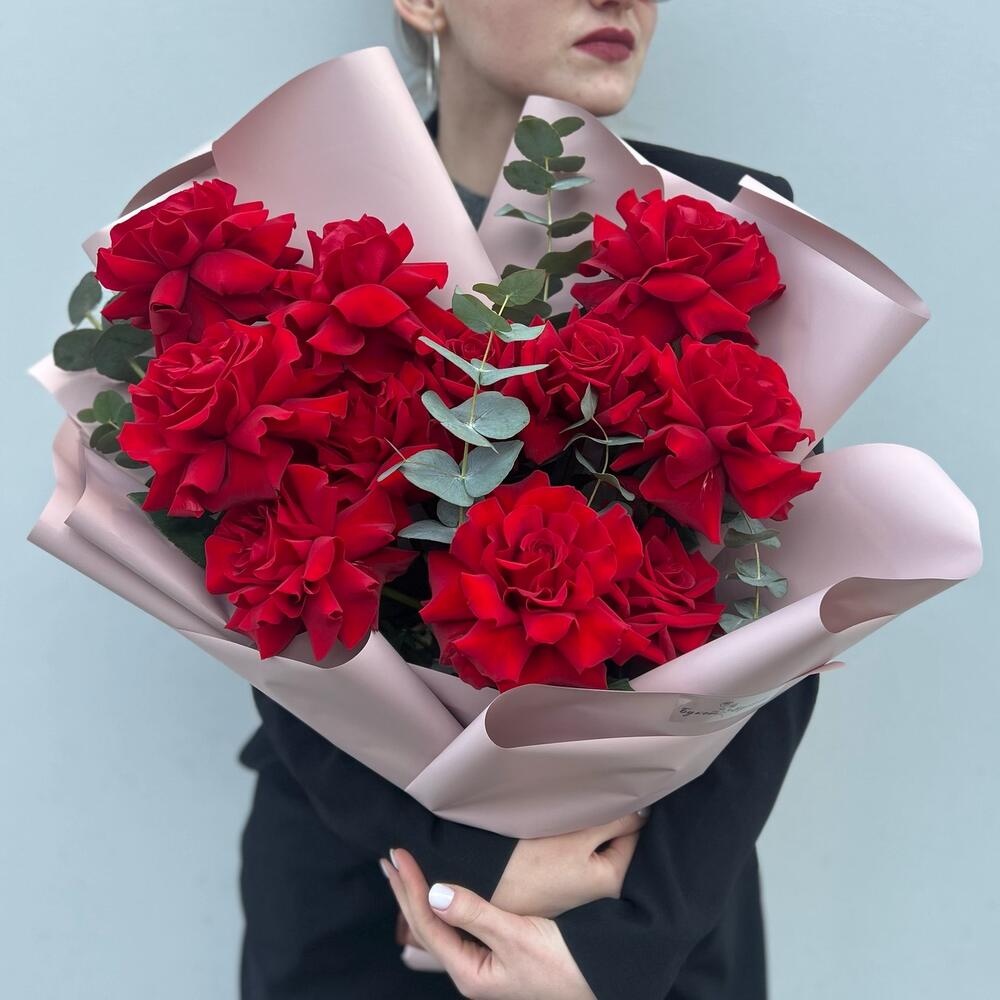 Эвкалипт – 1 шт.Лента органза – 1 шт.Пленка матовая – 2 шт.французская роза красная – 11 шт.