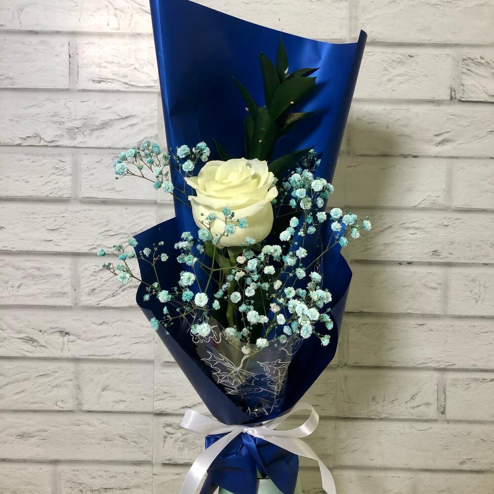 Гипсофила – 1 шт.Рускус – 1 шт.Упаковка – 2 шт.Лента атласная – 1 шт.Роза белая – 1 шт.