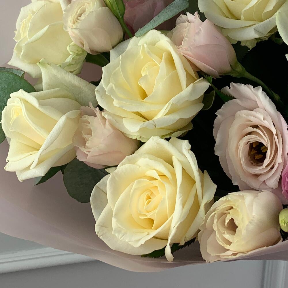 Лента – 1 шт.Лизиантус – 2 шт.Эвкалипт – 3 шт.Роза 50 см – 7 шт.Матовая пленка – 1 шт.